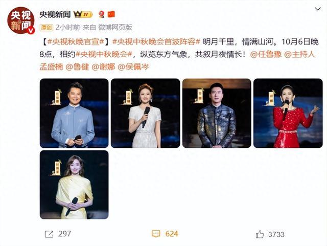 10月4日,@央视新闻 发文官宣中秋晚会主持人阵容: